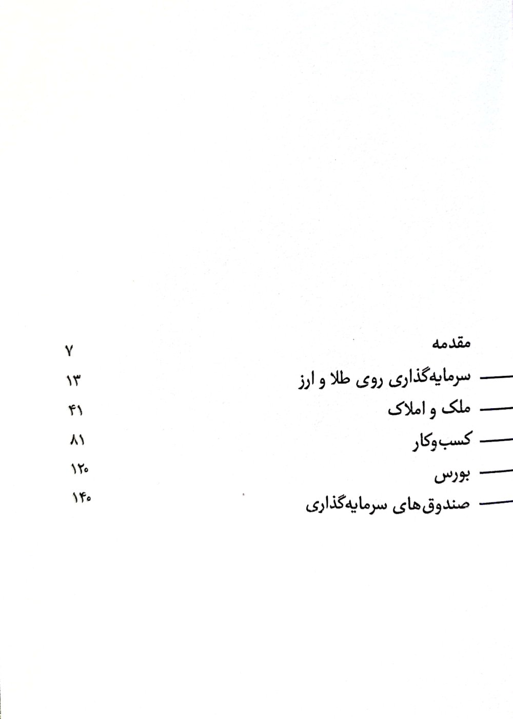 آموزش اصول مهم سرمایه گذاری در این کتاب، به شکل پرسش و پاسخ ارائه شده تا هم فهم مطالب بیشتر شود و هم خواندن کتاب آسانتر. این پرسش ها در پنج حوزه ملک و املاک، کسب و کار، بورس، طلا و صندوق های سرمایه گذاری تقسیم بندی شده اند.