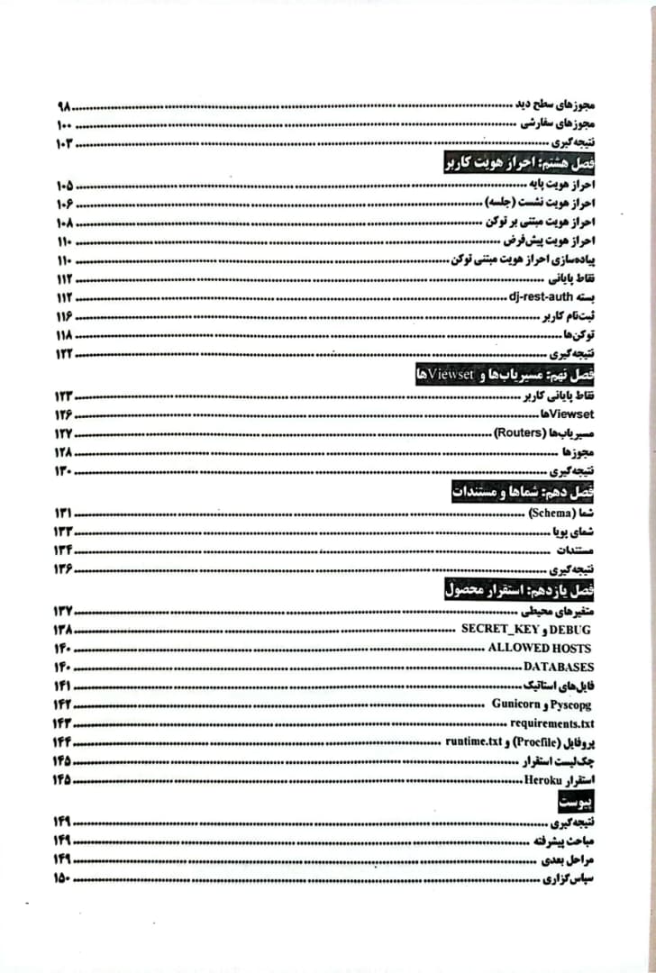 -پوشش کامل مباحث کلیدی: کتاب موضوعاتی مانند احراز هویت کاربران، سطح دسترسیها، Viewsets، Routers و مستندسازی API را بهطور جامع بررسی میکند.