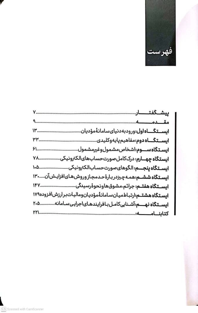 کتاب شامل 9 ایستگاه و مباحثی چون ورود به دنیای سامانه مودیان، مفاهیم پایه و کلیدی، اشخاص مشمول و غیرمشمول ، درک کامل صورت حساب های الکترونیکی ، همه چیز درباره حد مجاز و روش های افزایش آن، جرائم مشوق ها و نحوه رسیدگی، ارتباط میان سامانه مودیان و مالیات بر ارزش افزوده می باشد.