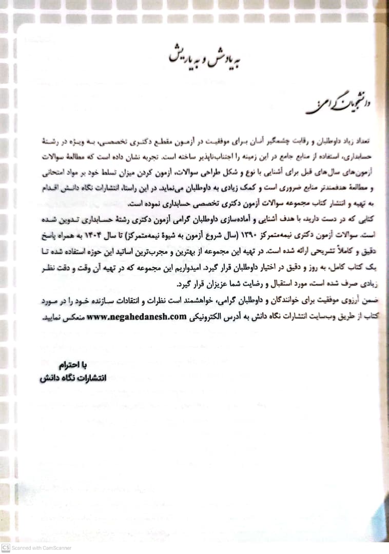 این کتاب با هدف آشنایی و آماده سازی داوطلبان گرامی آزمون دکتری رشته حسابداری تدوین شده است. سوالات آزمون دکتری نیمه متمرکز ۱۳۹۰ (سال شروع آزمون به شیوۀ نیمه متمرکز) تا سال ۱۴۰4 به همراه پاسخ دقیق و کاملاً تشریحی ارائه شده است. در تهیه این مجموعه از بهترین و مجرب ترین اساتید این حوزه استفاده شده تا یک کتاب کامل، به روز و دقیق در اختیار داوطلبان قرار گیرد.
