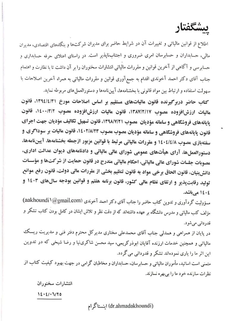 اگر بهدنبال یک منبع بینقص، بهروز و قابل اتکا برای تسلط بر قوانین مالیاتی ایران هستید، کتاب «مجموعه کامل قوانین و مقررات مالیاتی ۱۴۰۴» نوشتهی دکتر احمد آخوندی ، انتخابی شایسته برای شماست. زیرا نهتنها یک کتاب قانون است، بلکه یک نقشه راه آموزشی برای فهم عمیق و کاربردی نظام مالیاتی کشور محسوب میشود. این کتاب دربرگیرندهی قانون مالیاتهای مستقیم براساس اصلاحات مورخ1394/04/31، قانون مالیات بر ارزش افزوده 1387/2/17، قانون مالیات ارزش افزوده مصوب 1400/3/2، قانون پایانه های فروشگاهی و سامانه مودیان و مقررات مالیاتی مرتبط با قوانین مزبور از جمله یخشنامه ها، آییننامهها، دستورالعملها و بخشنامههای مالیاتی، آرای هیئتهای عمومی شورای عالی مالیاتی و دیوان عدالت اداری مرتبط با امور مالیاتی، و قانون بودجهی سال 1401 و 1402 می باشد. اگر تسلط واقعی بر قوانین مالیاتی هستید یا به دنبال یکی از بهترین کتابهای قوانین مالیاتی ایران، به عنوان منبع آزمون استخدامی سازمان امور مالیاتی، یا کتاب جامع مالیاتهای مستقیم و غیرمستقیم میگردید، این کتاب همان چیزی است که نیاز دارید.