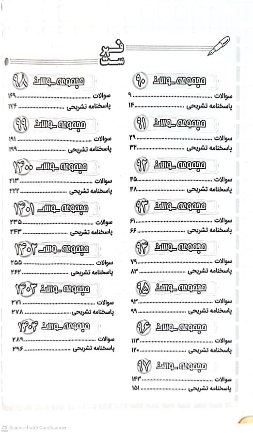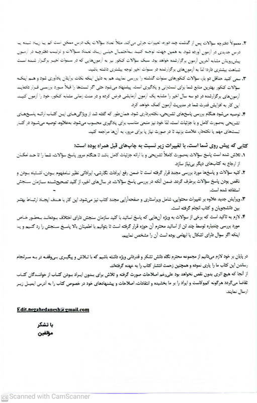 2. کلیه سوالات و پاسخ ها مورد بررسی مجدد قرار گرفته است تا ضمن رفع ایرادات نگارشی، ایراداتی نظیر نامفهوم بودن، اشتباه بودن و ناقص بودن پاسخ سوالات بر طرف گردد. ضمن آنکه در بررسی پاسخ سوالات در سالهای اخیر، از کلید تصحیح شده سازمان سنجش استفاده شده است.